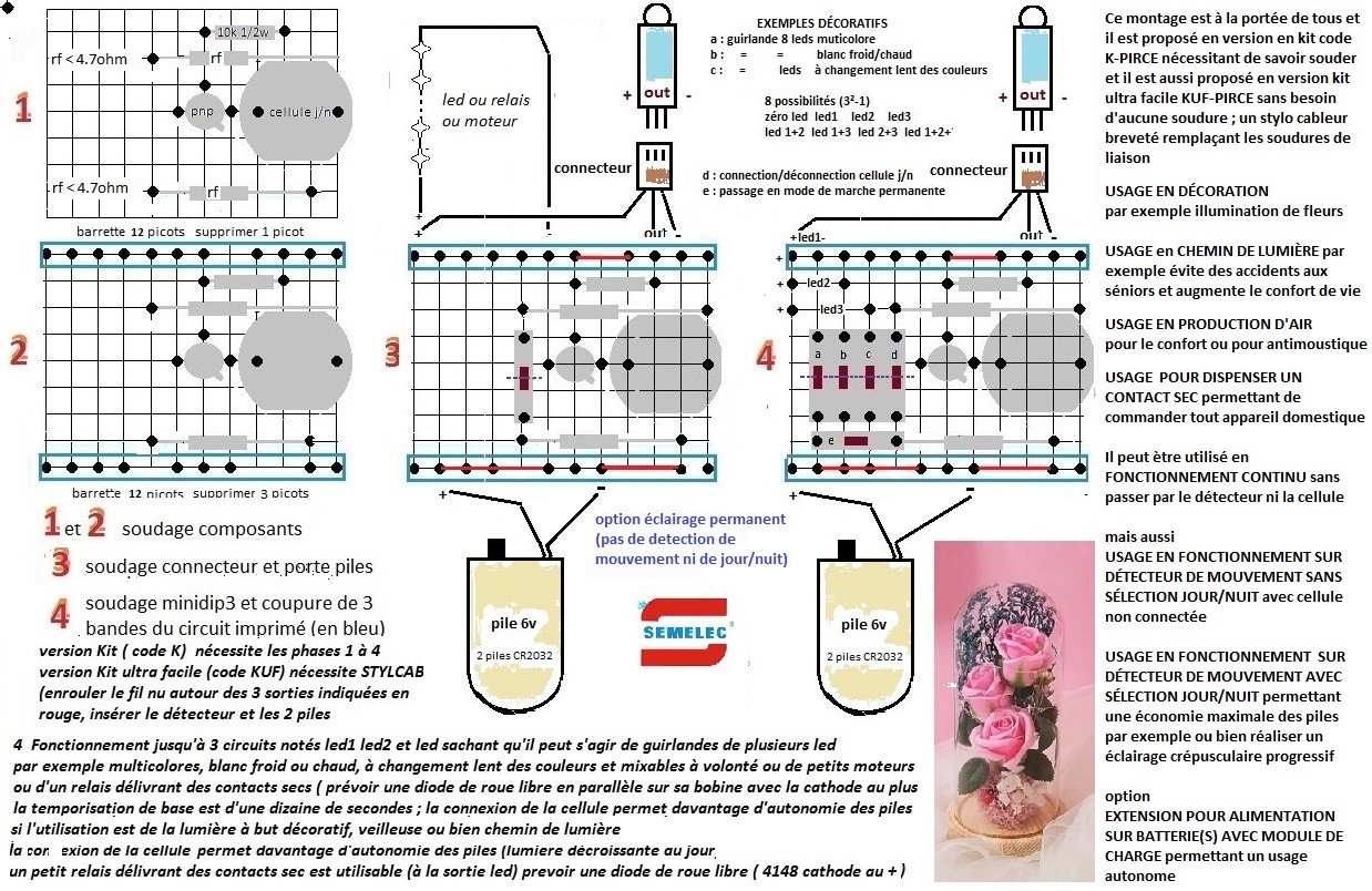Afin d'encourager les jeunes et les adultes et donner le plaisir de réussir son premier montage et mème sans connaissance prealable de l'électronqiue, il est proposé à vil prix un petit montage qui sera placé à la sortie de la source (piles jetables ou rechargeables) qui alimente les lampes ou les autres appareils (chauffage, moteurs etc.) la prouese a été réalisée de vous offrir pour moins de 10€ ---> le circuit imprimé, le détecteur de mouverment cablé sur son propre circuit imprimé, la temporisation, la cellule jour/nuit, un petit relais, un petit coffret étanche clipsé P643 Le reste en concertation gratuite avec un spécialiste 7jours sur 7 pour des conseils : pour la partie cellule jour/nuit voir aussi ce qui a été publié dans les guirlandes à boules pour assurer davantage d'économie (extinction automatique en allant se coucher) Pour la partie détection de mouvement le pêtit module passe partout sort sur un connecteur 3 broches (+ et - alimentation tension minimale de 2v7 consommation en veille 50 microampère et une broche centrale indiquée 'out' ; nous amplifions ce signal via un transistor bipolaire de type npn monté en commande de puissance (émetteur commun) et avec limitation du courant de base Ib par une résistance (10 k/6v alim) la charge ( lampes, relais, moteur etc.) étant branchée entre collecteur et + ps : c'est un montage réutilisable à l'infini et pouvant alimenter toutes charges via le contacts sec du relais